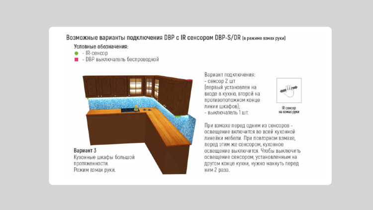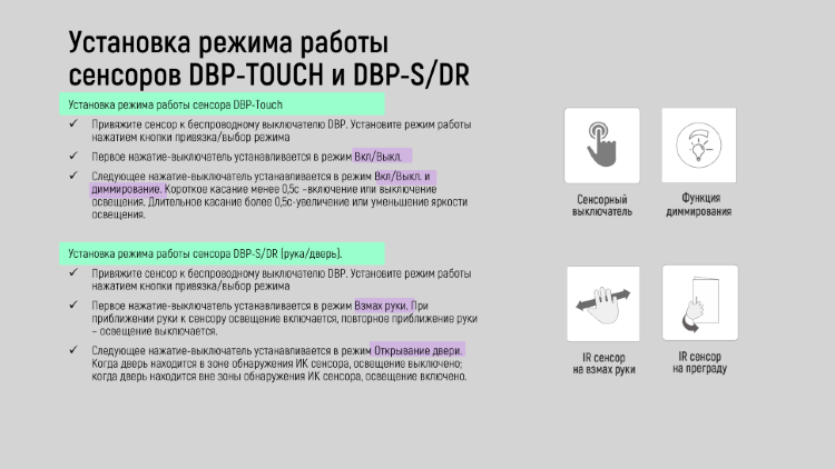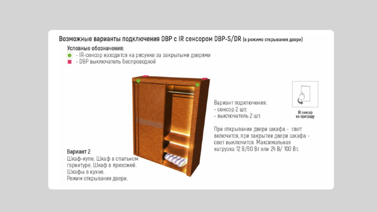 Эта модель беспроводного сенсора поддерживает определенный режим работы системы, так сенсор DBP-S/DR отрабатывает функцию включение/выключение освещения при взмахе рукой перед сенсором или при открывании и закрывании дверцы шкафа.