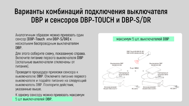 К одному сенсору можно привязать от 1 до 5шт выключателей DBP.