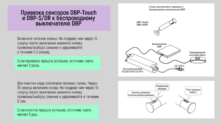 В разделе Документация подробно описана инструкция по привязки сенсора к выключателю DBP, которая производится с помощью кнопки привязки, расположенной на корпусе сенсора.
